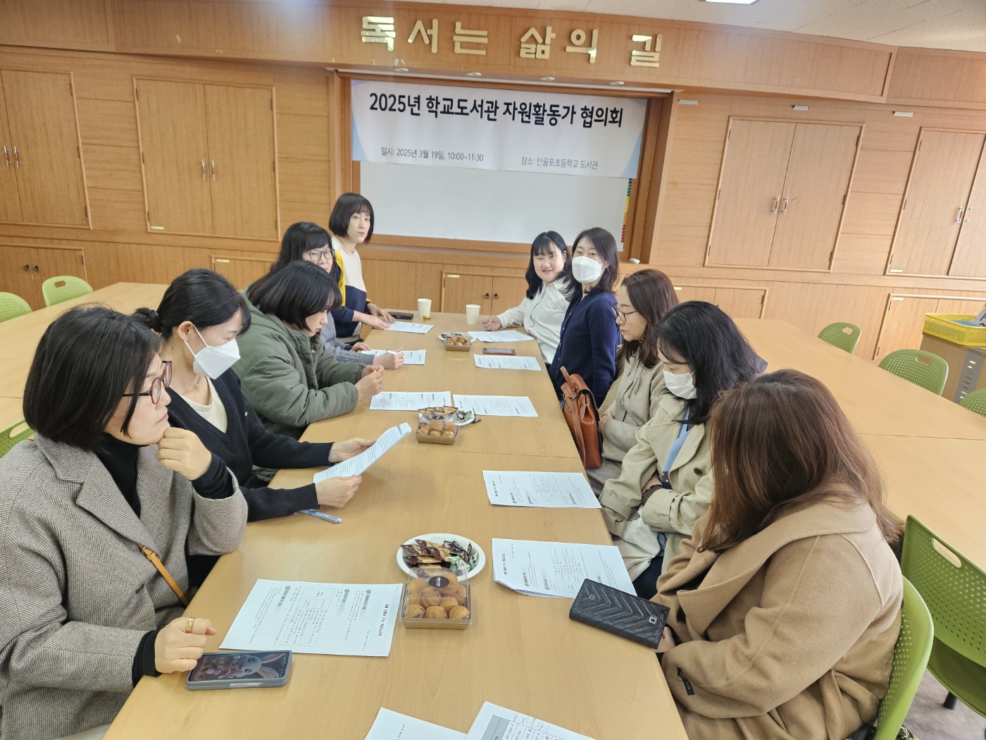 - 내용: 교장 선생님 환영 인사, 학교도서관 운영 전반, 독서동아리 조직, 책 읽어주세요 팀 조직, 임원 선출 등
